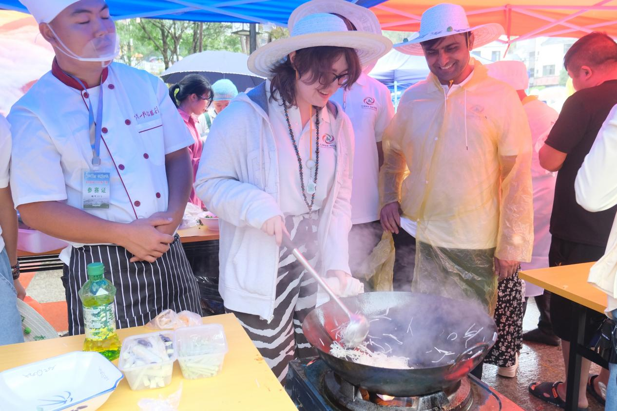 留学生们参观了青竹村的科普馆,了解当地物种的多样性和传统中医药的博大精深。村厨大赛决赛现场,厨师们选用本地种植的蔬菜、散养的家禽以及山涧溪流中的鱼虾等食材,现场展示各自精湛的烹饪技艺。在厨师的指导和志愿者的协助下,留学生们参与学做本地菜肴(茄子炒豆角、炒萝卜丝等)、体验抖糍粑的传统制作并品尝自己的劳动果实。大家齐心协力,在充满烟火气的氛围中感受中国乡村美食文化的魅力,进一步促进中外文化的交流与融合。