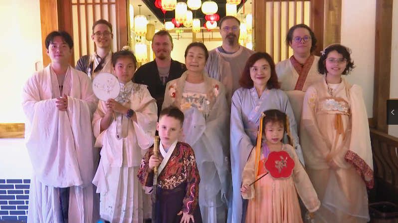 师生们穿戴上心仪的汉服和配饰,拾阶而上来到了三楼的唐朝诡事录VR国潮沉浸剧场,虚拟现实技术瞬间将大家拉回到唐代,体验VR技术打造的市井生活与悬疑剧情,使英国学员们沉浸式感受传统文化与现代科技的融合创新。大家非常喜欢这种中国传统服饰,而且又是第一次体验汉服,所以都兴奋不已。大家认为将汉服传统文化与现代科技相结合,令人耳目一新,仿佛穿越时空,亲身演绎大唐的传奇故事。