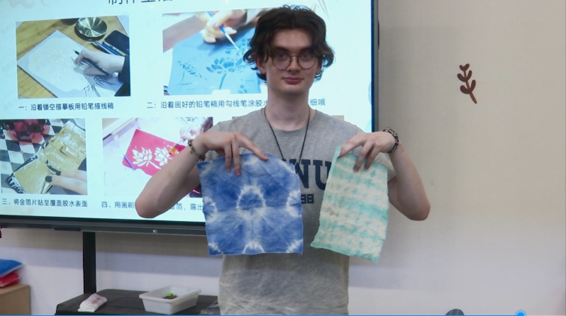 此次活动的最后一站是建湘工业研学基地,学员们听取指导老师介绍扎染及烧金箔画的原理、工艺流程和注意事项,了解了扎染的染料取自纯天然板蓝茎叶所制蓝靛泥,其工艺是绿色环保的。师生们一个个迫不及待地折叠手中的纱布,用皮筋扎成各种形状,幻想着各自泡染冲洗后成型的图案。后面的烧金箔画是一个细致活,包括绘图、涂胶、烧箔、贴箔、扫箔和装框等步骤,大家或绘图,或涂胶,或贴箔,或扫箔......好不忙碌,尤其是绘图和涂胶过程,稍有不慎,整个作品可能就“面目全非”了。大家禁不住感慨“中国艺术真是一个细致活,一点都不能马虎”!作品完成后,学员们满意地看着手中的扎染和烧金箔画手作,为自己学会了中国非遗传承初级工艺而点赞,也会将自己所学分享给周边的朋友,带回自己的国家,让更多的人认识和了解中国的非遗传承。