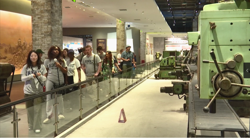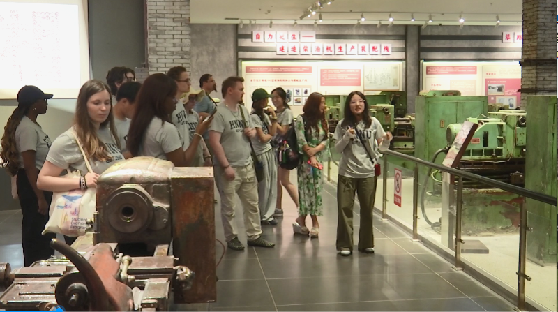 中英师生们走进衡阳老工业基地文展馆,观看历史实物,如墙上巨大的齿轮、展台上各色型号的柴油机、橱窗里的429枚建湘印章等,图文史料及多媒体展陈,系统了解衡阳作为工业基地的发展历程;车间办公室、钳工班、职工之家等场景展示则帮助师生们重现当年“衡阳制造”的工作环境和人文关怀。从早期工业的艰难起步到蓬勃发展,再到当前的转型升级,每一段历史都深深吸引着英国学子们的目光。他们时而驻足欣赏,饶有兴致地与身旁师生一同追溯“衡阳制造”的工业记忆。