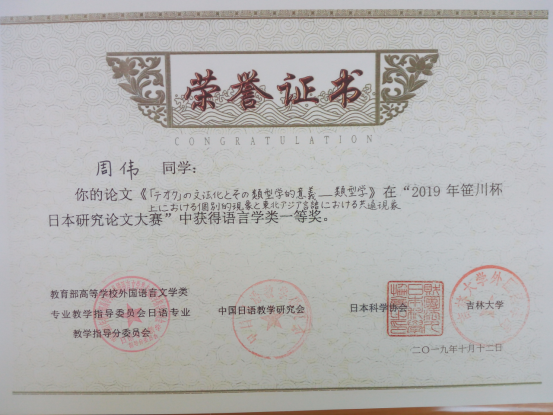 我校日语系本科生周伟荣获“2019年笹川杯全国日本研究论文大赛”一等奖