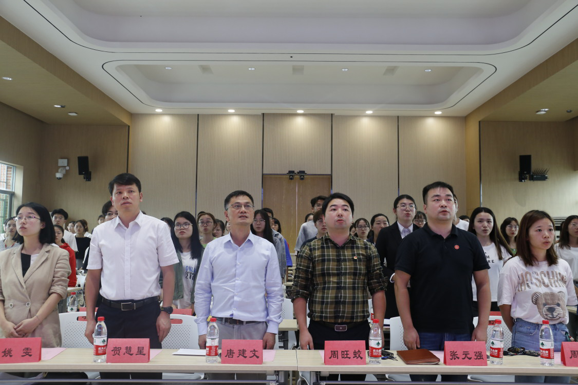 大会伊始,全体起立,奏唱国歌。