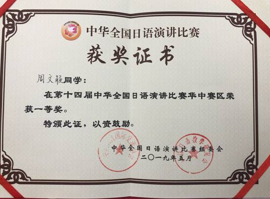 (供稿 日语系)2019年5月4日,由中国教育国际交流协会、日本经济新闻社、日本华人教授会联合主办,中国日语教学研究会协办的“第十四届中华全国日语演讲比赛华中赛区”在华中师范大学成功举行。由澳门pg官网日语系杨柳老师指导的2015级周文颖同学,经过激烈角逐和比拼,取得了本次大赛一等奖的优异成绩。杨柳老师获得“优秀指导教师奖”。