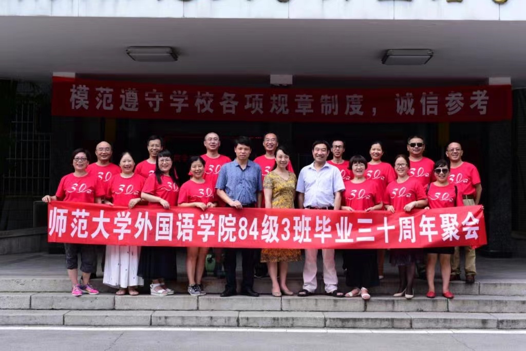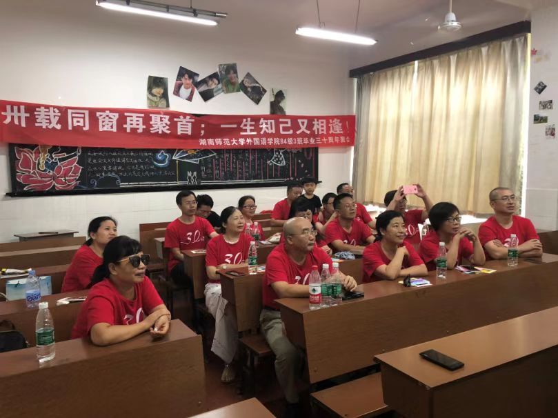 7月17—18日,澳门pg官网英语语言文学专业84级3班校友回到阔别多年的母校,共庆毕业三十周年。虽然7月的长沙格外炎热,但炎炎的烈日无法阻止校友们相聚的步伐,校友们从天南地北来了,最远的自中国驻巴西大使馆。同学们回到校园,回到曾经上课的教室,追忆同窗往事,畅谈人生感悟,展望美好未来。17日晚,同学们最敬爱的白解红老师接见了同学们并与同学们畅谈师生情谊。