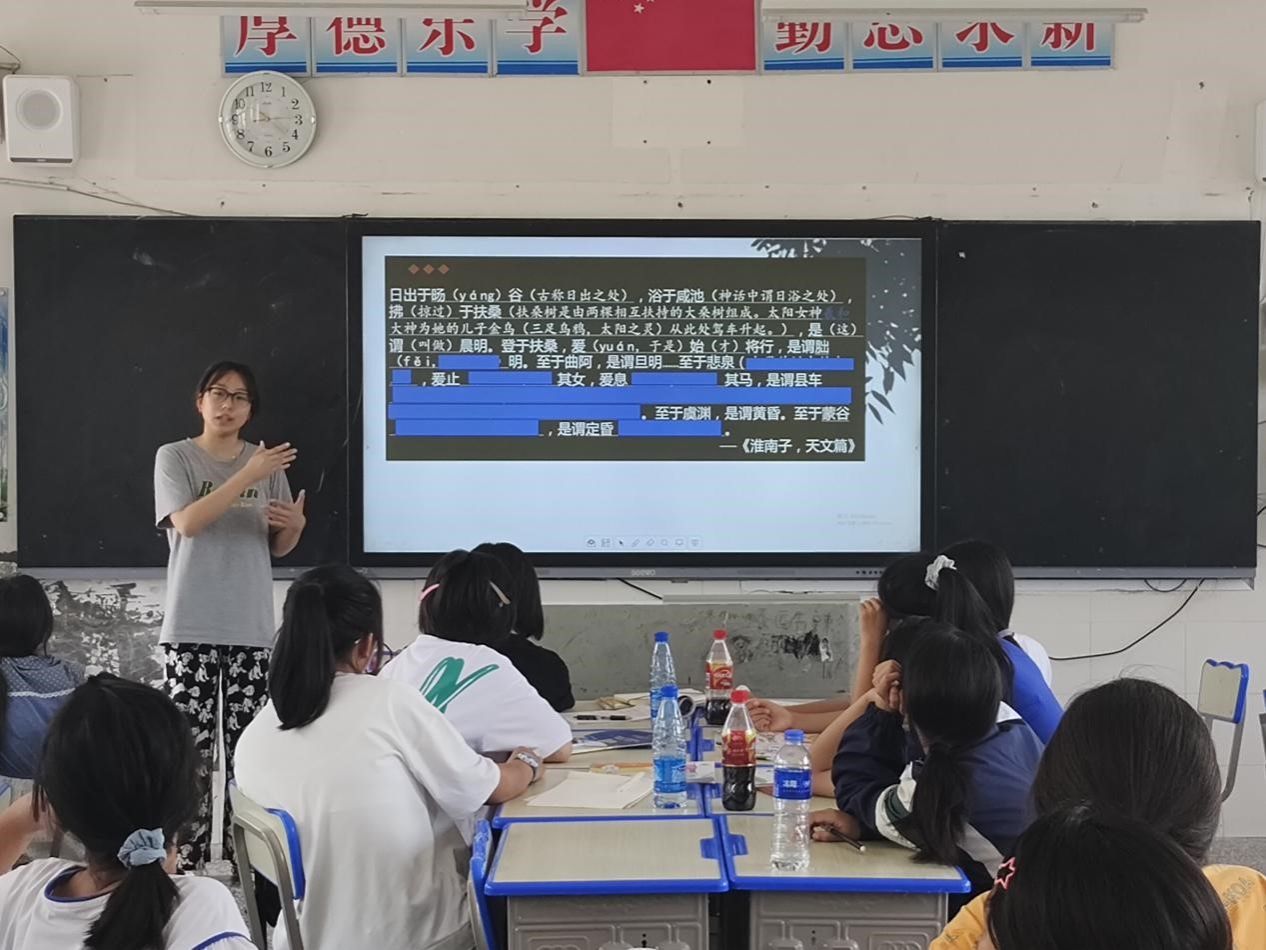 丁昕怡向学生们介绍了中国古代太阳女神羲和,并且通过讲述“羲和浴日”的神话以及分析记载“羲和”的古文来引起学生们对课堂内容的兴趣。学生们各抒己见,积极参与课堂,表达对羲和的认识与理解。此外,丁昕怡向学生们介绍了我国古代有关“太阳崇拜”的文物史料,由“太阳崇拜”链接到中国古代神话,简单扼要地分析了中国古代神话和西方古代神话产生差异的原因。有趣的思考题和奇妙的神话故事使得此次课堂氛围积极且活跃,强化了学生们对中国古代文明的认知,激发了学生们对阅读神话的兴趣。