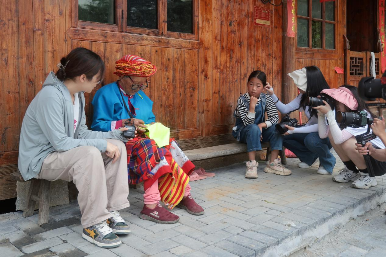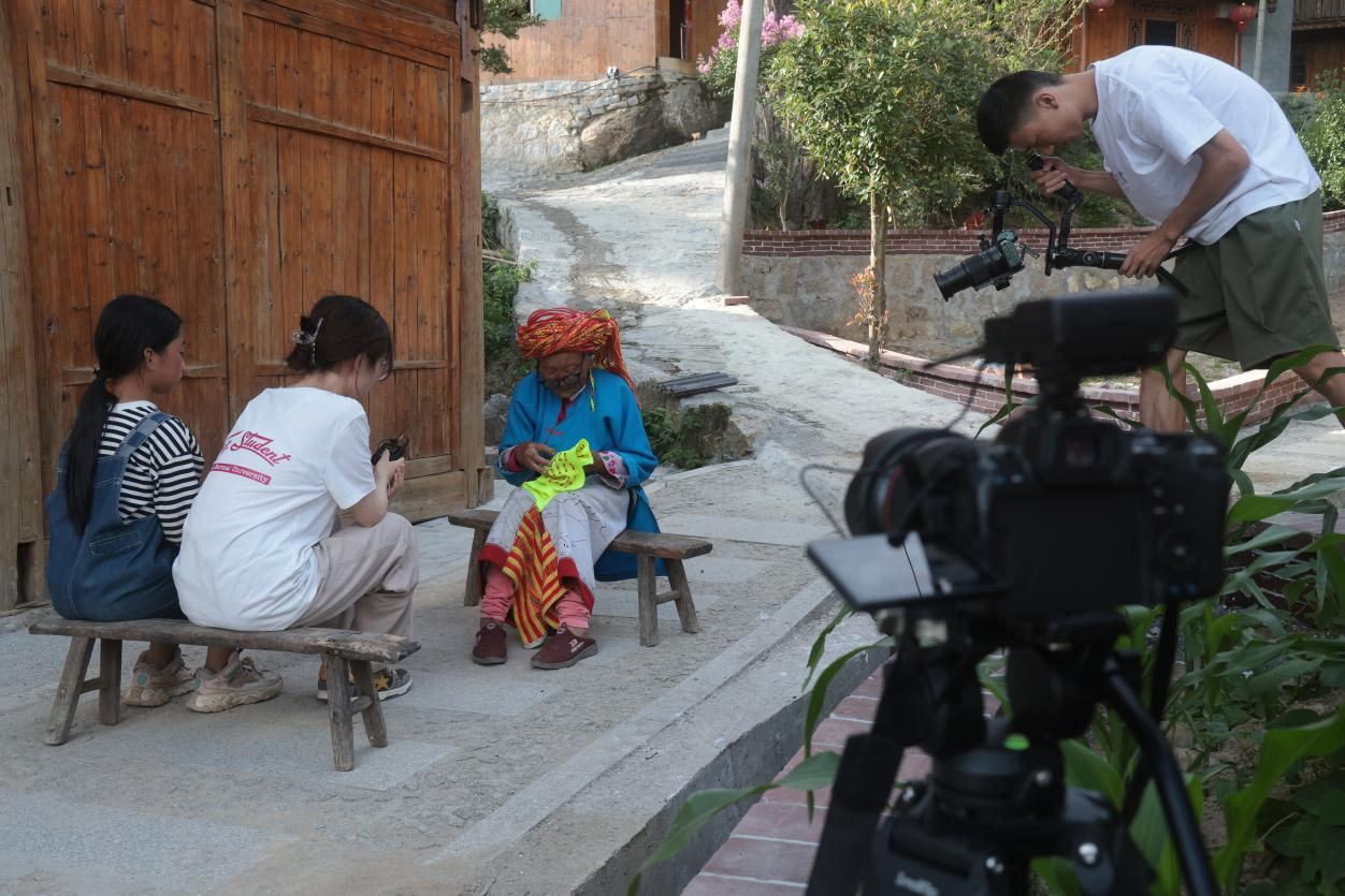 在崇木凼村有着这样一群人:她们身着艳丽的花瑶服饰,手里拿着布和针线,端坐在家门口的矮凳上,认真地挑着手里的一针一线。她们大多是年逾半百的“花瑶老人”,没有通讯工具,更不会说普通话,团队成员与其沟通交流的过程中存在着诸多困难。起初,面对陌生的镜头,他们的第一反应是抗拒,但在团队成员表明来意后,她们欣然接受了采访。