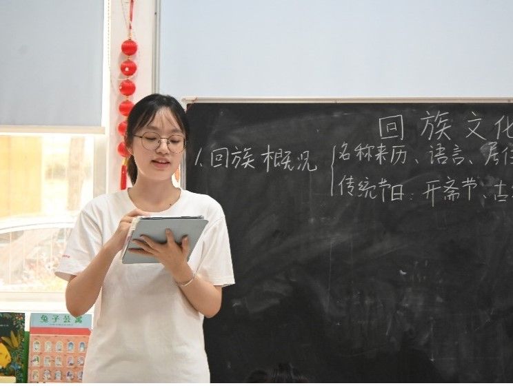 实践团成员赵含嫣、张凯燕开展回族文化课堂。此次课堂让学生了解了丰富的回族文化,引导学生尊重各民族文化。实践团成员详细阐述了回族的民族概况,依次介绍了回族的名称来历、语言使用、人口分布与宗教信仰情况,增加学生对回族概况的认识;以展示图片与视频的方式,促进学生了解回族的传统节日、传统服饰和饮食文化,引导学生尊重少数民族的传统习俗与饮食禁忌。课堂上实践团成员呼吁学生了解各民族的优秀文化,并尊重各个民族的独特文化。