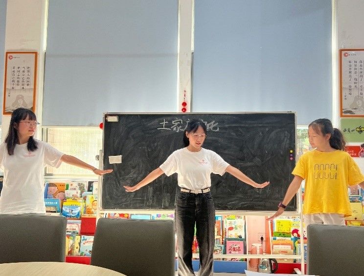 实践团成员向璐、李莹负责土家族文化课堂。土家族文化课堂围绕艺术、服饰、节日、饮食四个方面介绍了丰富的土家族文化。实践团成员以土家族著名的摆手舞作为切入点,展示摆手舞并带领学生学习摆手舞以调动学生参与课堂的热情;通过图片展示了土家族精美的传统服饰,并引导学生思考绣花图案的美好寓意;介绍六月六、女儿会等土家族传统节日,分享蒿草粑粑、糯米粑粑等土家族传统美食的制作方法。此次课堂以分别来自汉族和土家族的两位实践团成员之间的对话展开,一问一答中不仅展示了丰富多彩的土家族文化,而且呈现出民族团结一家亲的氛围。