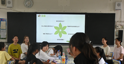 在课程准备环节,实践团成员收集了学生们青春期成长过程中的困惑,整理概括为四个方面:学习、家庭、自我认识、交际。成员们就每个方面选取了几个典型问题与学生们交流探讨,并结合自身经历阐述了解决青春期困惑的方式方法。随着更深入的交流,课程氛围愈发活跃,学生们也开始主动表达、积极分享。