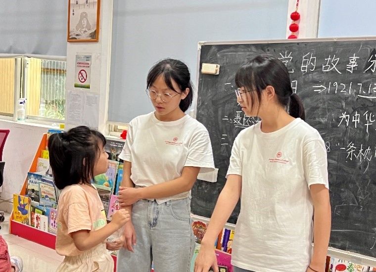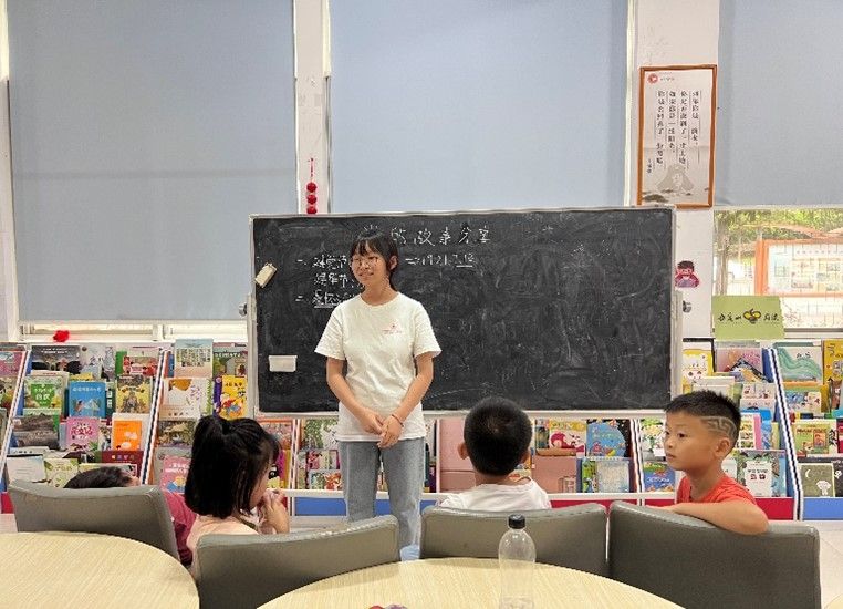 实践团成员沿着百年党史,讲述红色故事,带领学生感悟党的伟大精神。实践团成员首先介绍了中国共产党成立的时间、地点和历史背景,并联系社区生活,带领同学们学习一代代共产党员为人民服务的精神。在讲述“聂槐汝妙计送盐”的故事时,实践团成员将日常生活中常见的“盐”与艰苦的革命时期联系起来,带领学生在今昔对比中感受党的艰苦奋斗精神。为了帮助小朋友们从小树立远大理想,实践团成员讲述了周恩来总理“为中华之崛起而读书”的故事,引导同学们从中汲取精神力量。此外,在实践团成员的激励下,同学们各抒己见,主动分享了雷锋、王二小等英雄的光荣事迹。学生们在讲述红色故事的过程中,对历史有了更深刻的印象,对革命精神有了更深刻的理解。