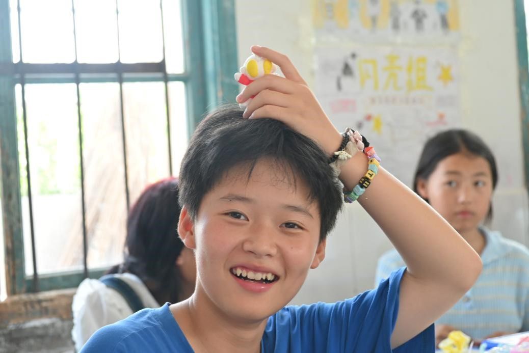 此次课程分为两次进行。在第一堂课上,宋奕芳和胡煜杰向学生们展示了扭扭棒作品和轻黏土作品图片。作品图片的展示考虑了难易程度且结合了当下流行趋势,以此引起学生兴趣。学生自主动手完成作品后,实践团成员们给予充分肯定与赞美,增强学生自信心。对于动手能力有待加强的学生,实践团成员耐心讲解引导其动手制作。课后,所有学生与自己的作品合影,留下纪念。学生们脸上的笑容是此节课堂效果最好的反馈。