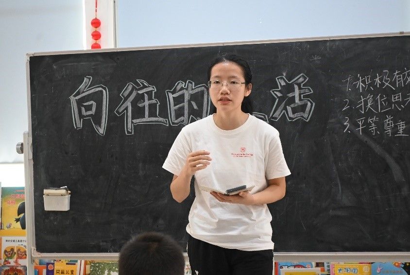 在社会生活方面,实践团成员王文静带领学生忆往昔、看当下、展未来。她介绍过去人们的衣食住行,描述曾经物资紧缺的岁月,与当前社会进行对比,让同学们认识到社会生活发生的翻天覆地的变化,并启发学生思考导致变化的原因,让学生理解先辈们的无私奉献。随后,她引导同学们展望未来,思考自己向往的社会生活,鼓励他们以先辈为榜样,坚定理想信念,为向往的社会生活努力奋斗。