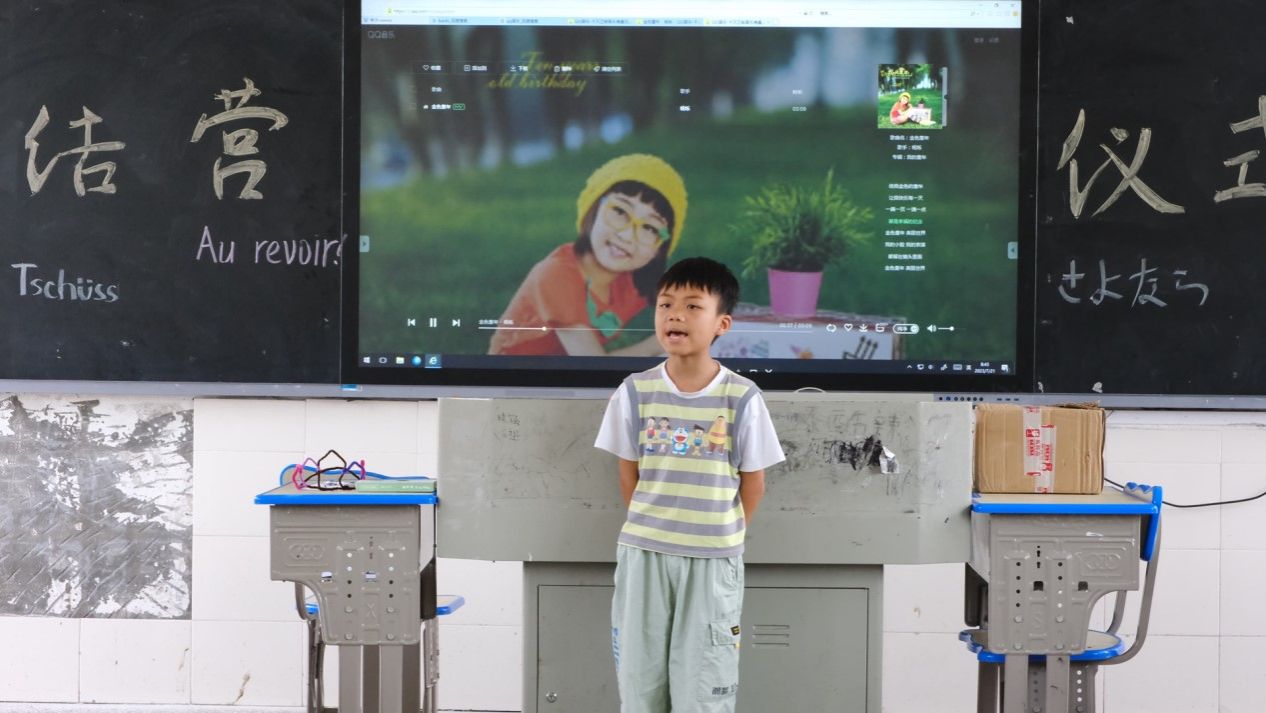 发言环节结束后迎来了表演活动,节目丰富多彩,精彩纷呈。学生石永苗以独唱儿童歌曲《金色童年》开场,纯净的童声治愈了在座的师生。学生饶润华表演苗族武术,一招一式中流露出苗族文化和传统的魅力。学生石永鑫、石顺武、王佳利、饶润华演唱《纪念》《蒲公英的约定》等歌曲,展现了花垣四中的学生们对实践团成员的不舍。随后,花垣四中的学生们进行《神偷奶爸》《精灵旅社》片段英语配音表演,并合唱歌曲《我和我的祖国》。孩子们悠扬的歌声使实践团成员感动不已。随后实践团成员们播放了精心制作的结营视频,视频记录了两周中师生的日常互动与学生作品,收获现场所有人的掌声。在欢笑声中,实践团成员们共同合唱《see you again》,为此次结营仪式画上圆满的句号。