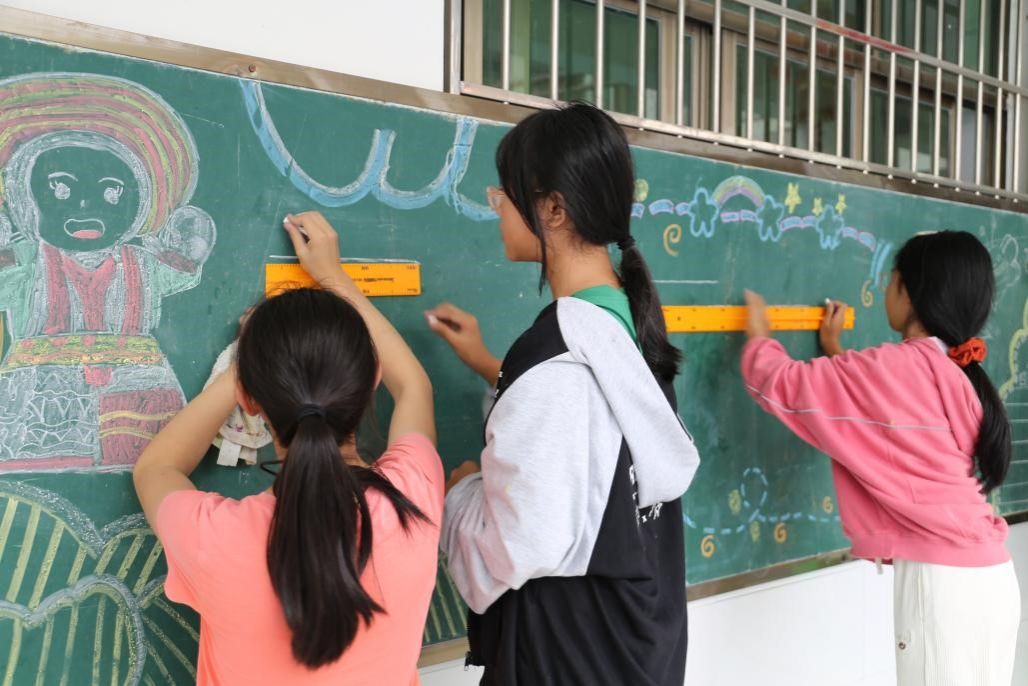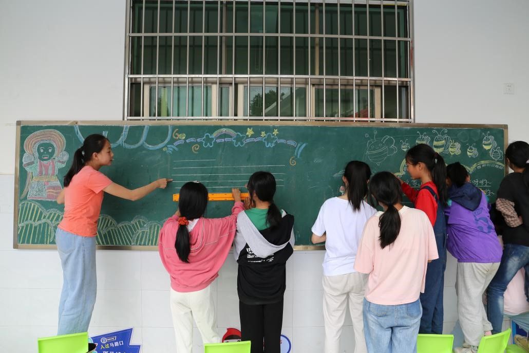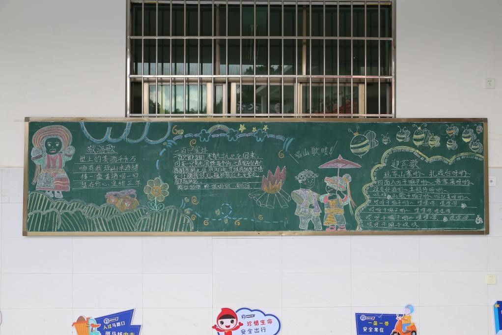 作为国家非物质文化遗产,花瑶呜哇山歌是草原学校同学们的一门必修课,草原学校的孩子们人人会唱山歌,人人爱唱山歌。在此次美术节中,实践团也组织同学们开展了“一路山歌”主题板报活动。在经过一番精心的图案构思和版面设计后,同学们开始动手绘制黑板报。同学们分工合作,在黑板上画出“唱山歌”的卡通花瑶人物,并板书“一百只蜜蜂”“迎宾歌”“敬酒歌”三首山歌的歌词,让图文并茂的黑板报成为校园中一道亮丽的风景线。