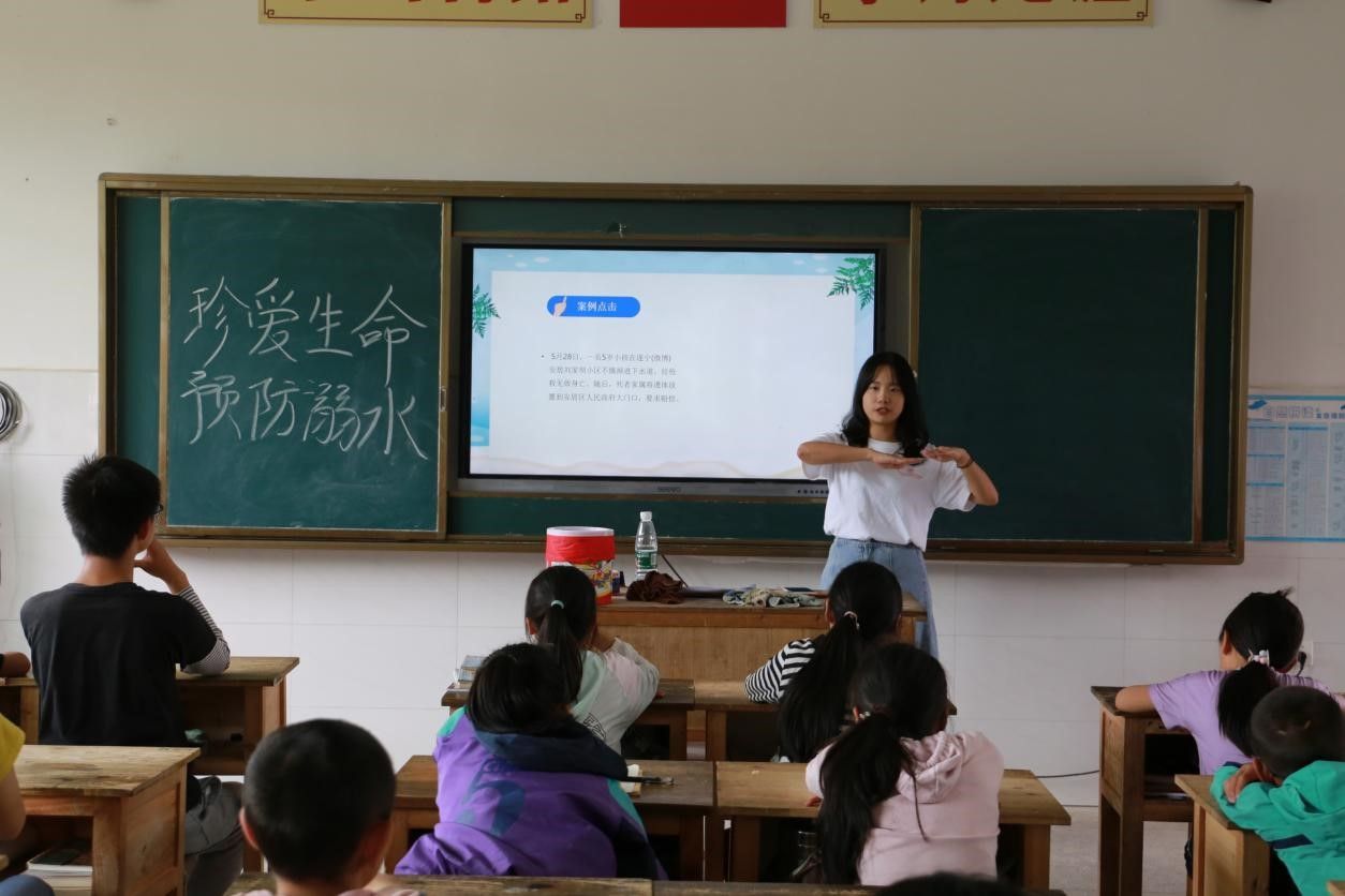 为了加强学生们的心理防范意识,了解防溺水的安全知识,保障其人身安全,实践团成员结合实际案例与理论知识,多角度向同学们强调了加强预防溺水教育的重要性。通过分享自身的亲身经历,吴晴雯向同学们详细地讲述了溺水的表现、溺水如何自救以及遇到他人溺水应如何施等安全知识,并且反复提醒同学们一定要在大人的陪同下,前往安全熟悉的水域游泳。