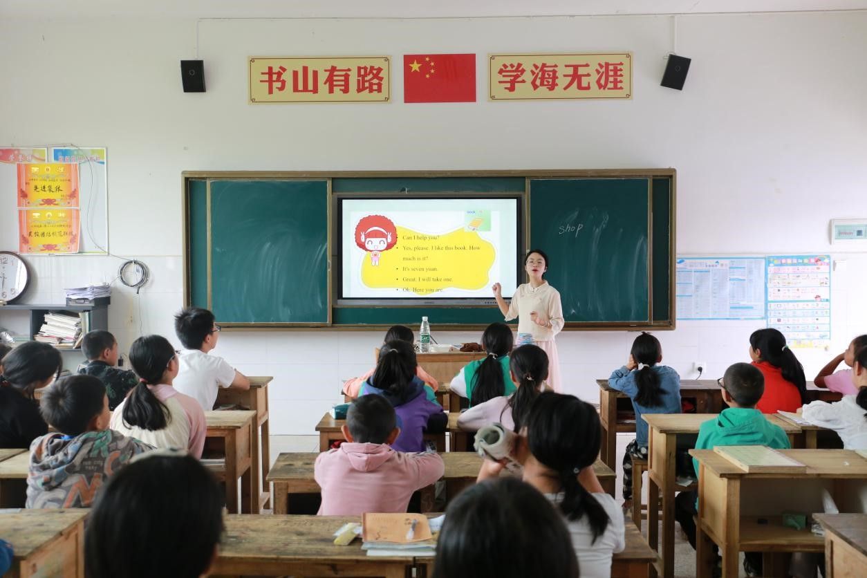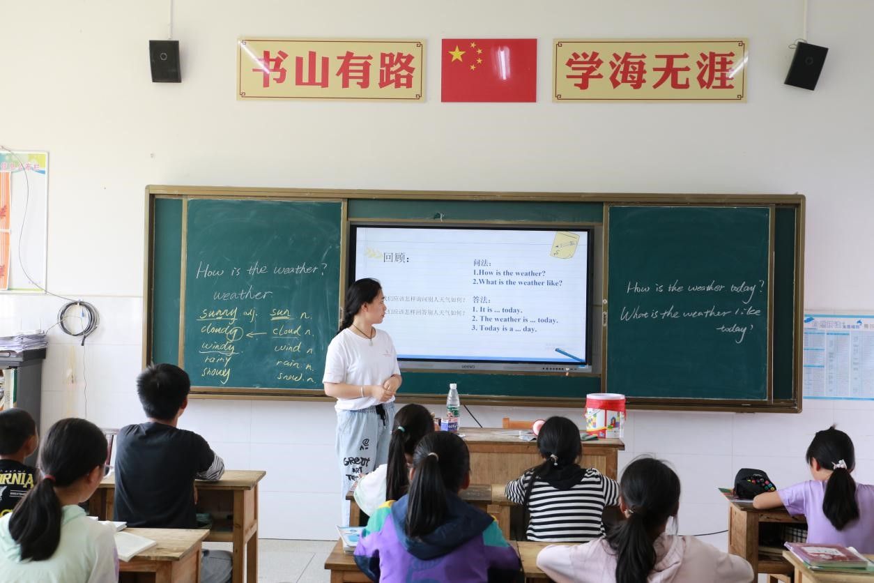 姜涵菁在天气播报课堂中以虎形山草原村当地气候为例,引导学生们在特定的生活情境中勇于开口说英语。她向同学们介绍"It's sunny in Caoyuan Village today." "Caoyuan Village is cool all year."等表达方法,鼓励同学们在日常生活中使用英语来描述天气,介绍自己的家乡。此外,姜涵菁还结合课堂主题向同学们介绍并解释了英文谚语“It rains cats and dogs”,让同学们感受到了学习英语的乐趣。