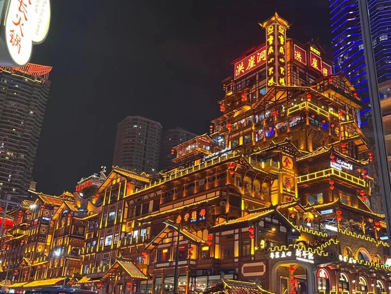 经过调研,考察团一行体会到,长沙与重庆两座城市都接受了西方赛博朋克文化最广为人知的视觉元素,在城市形象建构中充分利用霓虹灯、全息投影等勾勒出摩天大楼与老街小巷高低错落、交织分布的夜景。但由于地形与文化差异,二者对视觉元素的运用存在差异。从建筑布景看,重庆地形以山地丘陵为主,建筑大部分为纵向分布,街景呈现为高低错落的光影效果;而长沙地形平坦,采用横向布置建筑,呈现出条状光影效果。从城市形象塑造本质来看,长沙对赛博朋克思潮的理解落点在将城市建筑风貌与湖湘人文传统融合,重点突出人与科技的碰撞与融合以及本土文化的焕新魅力;而重庆对赛博朋克的应用表现在利用赛博朋克元素彰显山城地形、形貌特点,彰显建筑风格的多样性,以此推广独特城市形象。