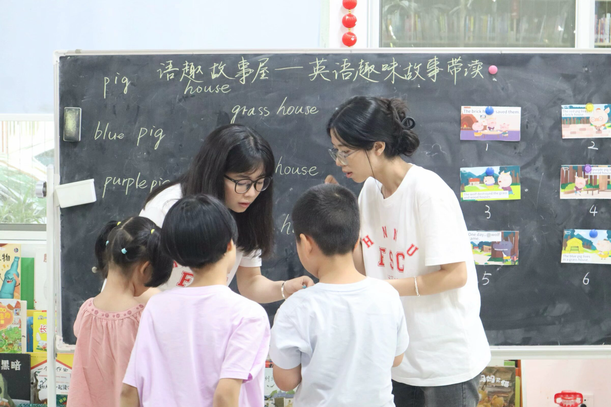 在教学过程中,实践团成员将《三只小猪》的故事、动画片段、词汇学习以及互动游戏融合于此次趣味特色课堂中,以此激发小朋友们对英语学习的兴趣,并增强他们对故事情节的理解。此外,成员们还以故事中的角色为例,引导小朋友们通过观察素材图片和复述故事情节,学习并运用实用英文句型,使他们在具体的语言环境中感受英语表达的乐趣。这一教学环节充满趣味性,有效地提升了小朋友们的课堂参与度和学习热情。