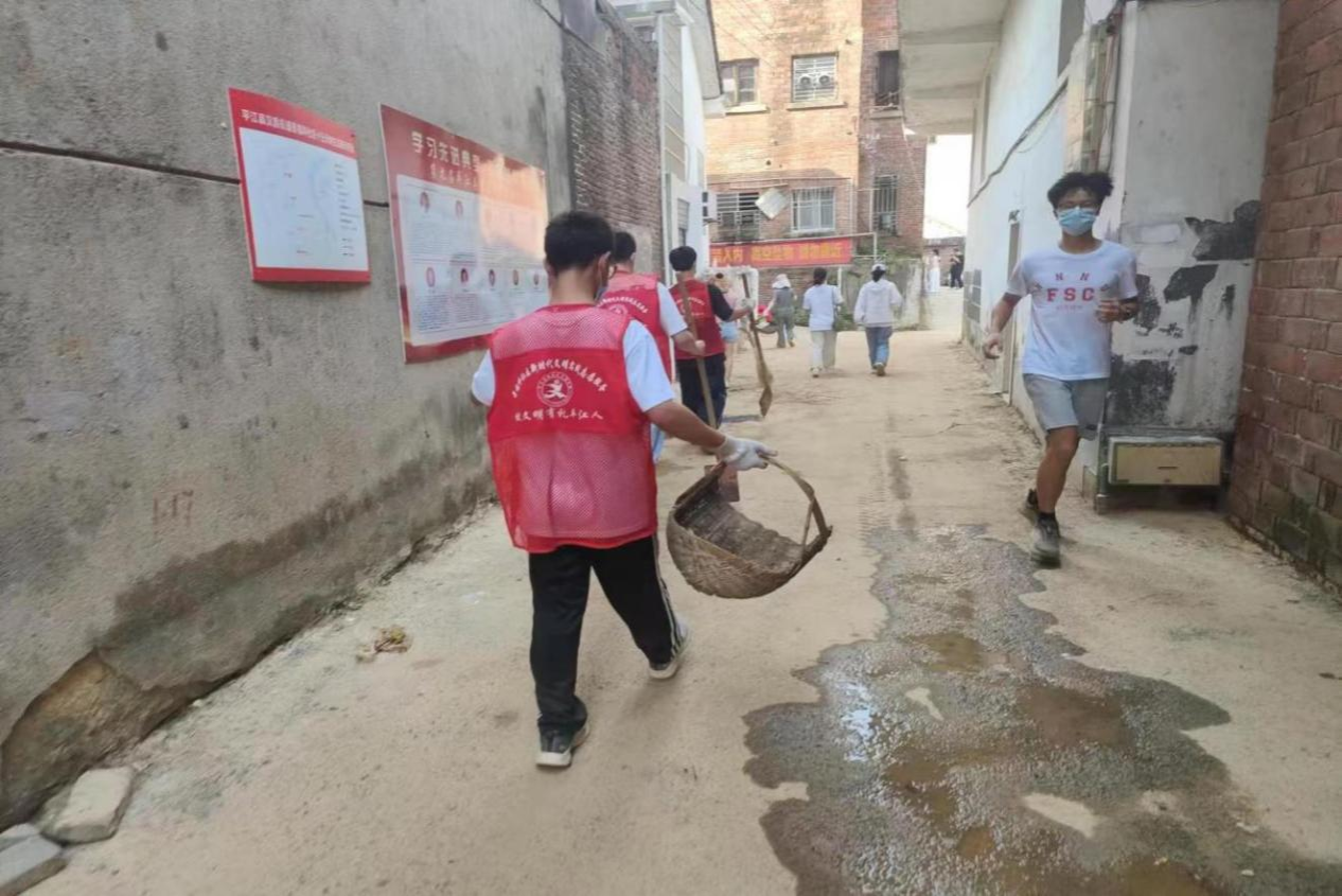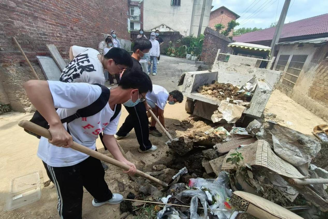 在平江县人民政府官网上发布的《关于积极参与支持配合城区垃圾清理秩序恢复工作的倡议书》中得知平江现有清淤任务之后,实践团主动联系当地实践站开展清淤活动。活动开展前,工作人员为实践团提供手套,铲子等工具。大家开始进行分工协作,男生联合当地志愿者开始铲除淤积物,女生将淤积物附近的大小型物件协力搬运到拖拉机上,齐心协力以最快速度清除垃圾和淤积物。在三小时的清理过程中,实践队清理一处淤泥堆积处,两处垃圾堆放点,共清理出五车垃圾。清理工作完成后也使当地街道焕然一新。