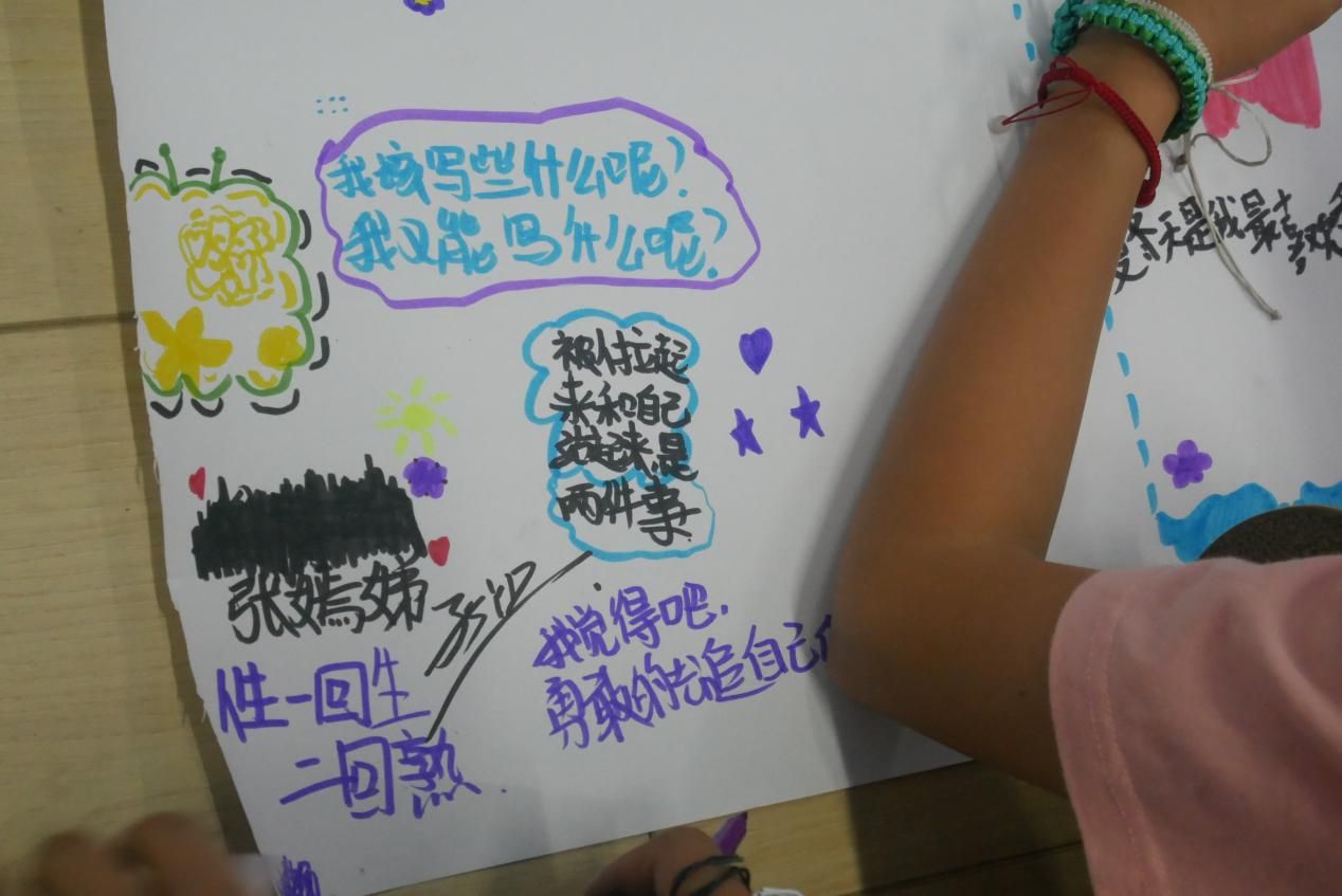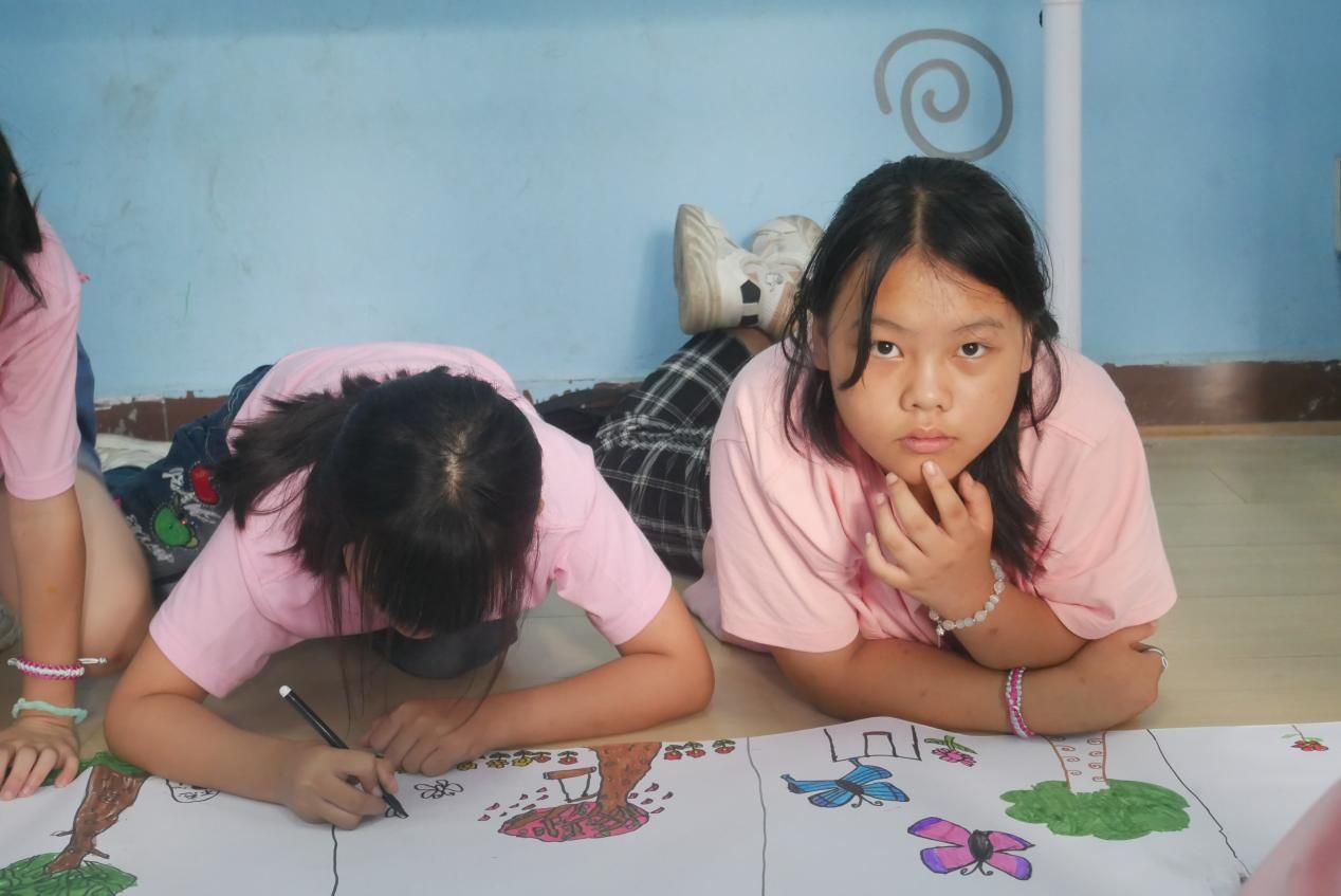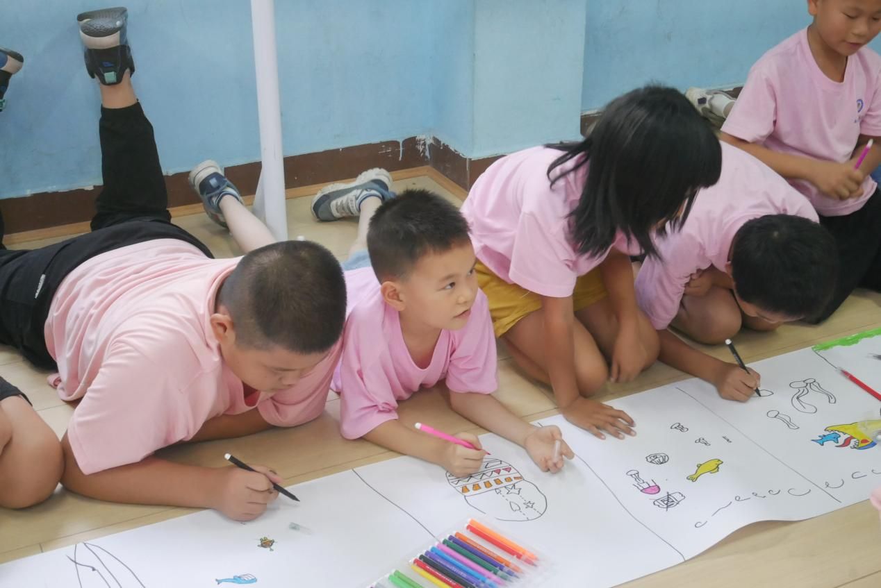 在整个创作过程中,营员们展现了自己天马行空的想象力和创造力,从图案的初步起草到后期的色彩涂抹,每位营员都贡献了自己独特的想法。营员们用色彩斑斓的线条和图案,描绘了自己心中的英雄、梦幻的童话世界以及对未来的各种幻想。实践团成员们参与其中,与营员们共同绘制,同时引导营员们,鼓励他们发挥创意,勇敢表达。营员们之间互相交流讨论,对各自的画卷内容提出了改进建议,一起让画卷内容更加丰富。
