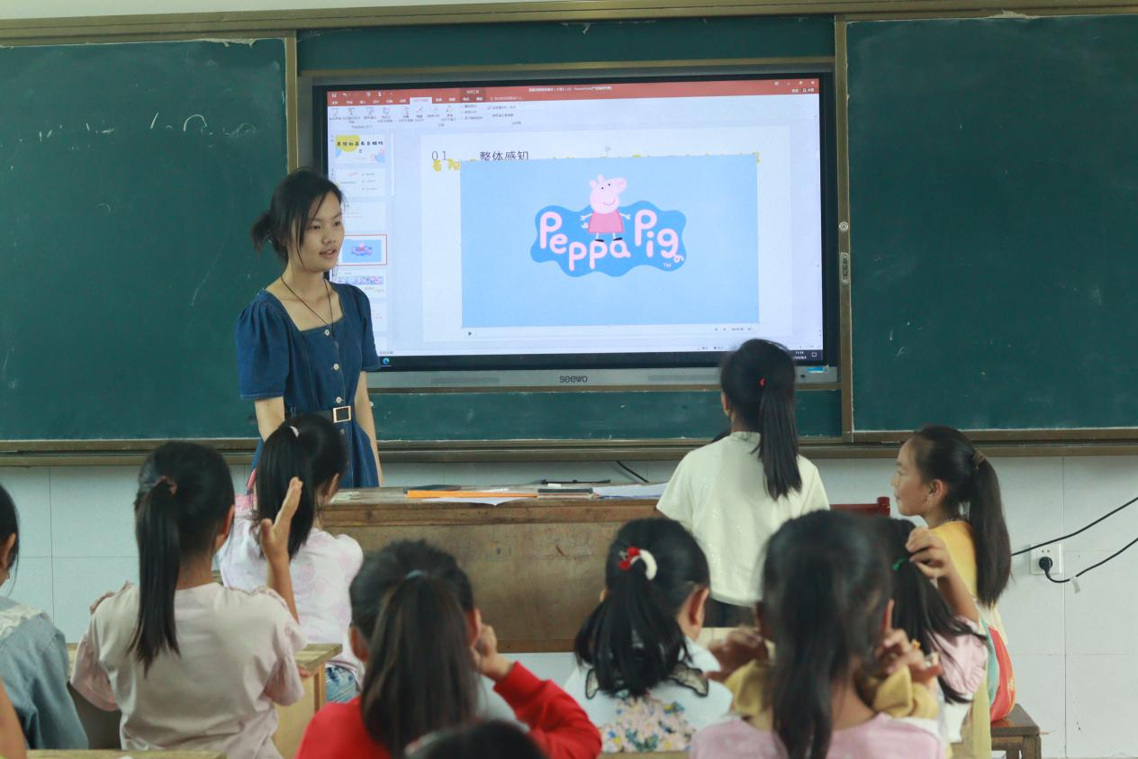 英语动画角色模仿课程中,实践团成员以《小猪佩奇》视频片段引入,带领学生们关注语气变化和语调轻重。随后,喻文佳对台词逐个分析并带读,最后运用分组表演展示的形式检验学习成效,激发了学生们探索知识的积极性和获得新知识的成就感。学生们自发上台表演、主动分享,有声有色的趣味课堂很受学生们喜爱。