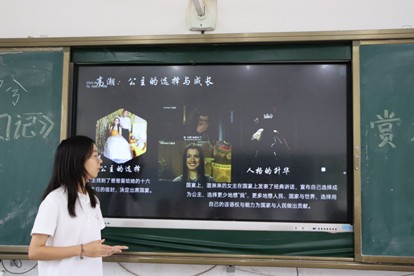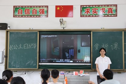 实践团围绕既定教学目标,将电影课分为两阶段有序推进。在第一节课的规定时间内,学生们观看《公主日记》的核心片段,其内容包括主人公米娅的公主身份被揭露、米娅的公主改造过程、米娅在晚宴上的混乱表现以及米娅成为吉诺维亚公主的最终抉择。