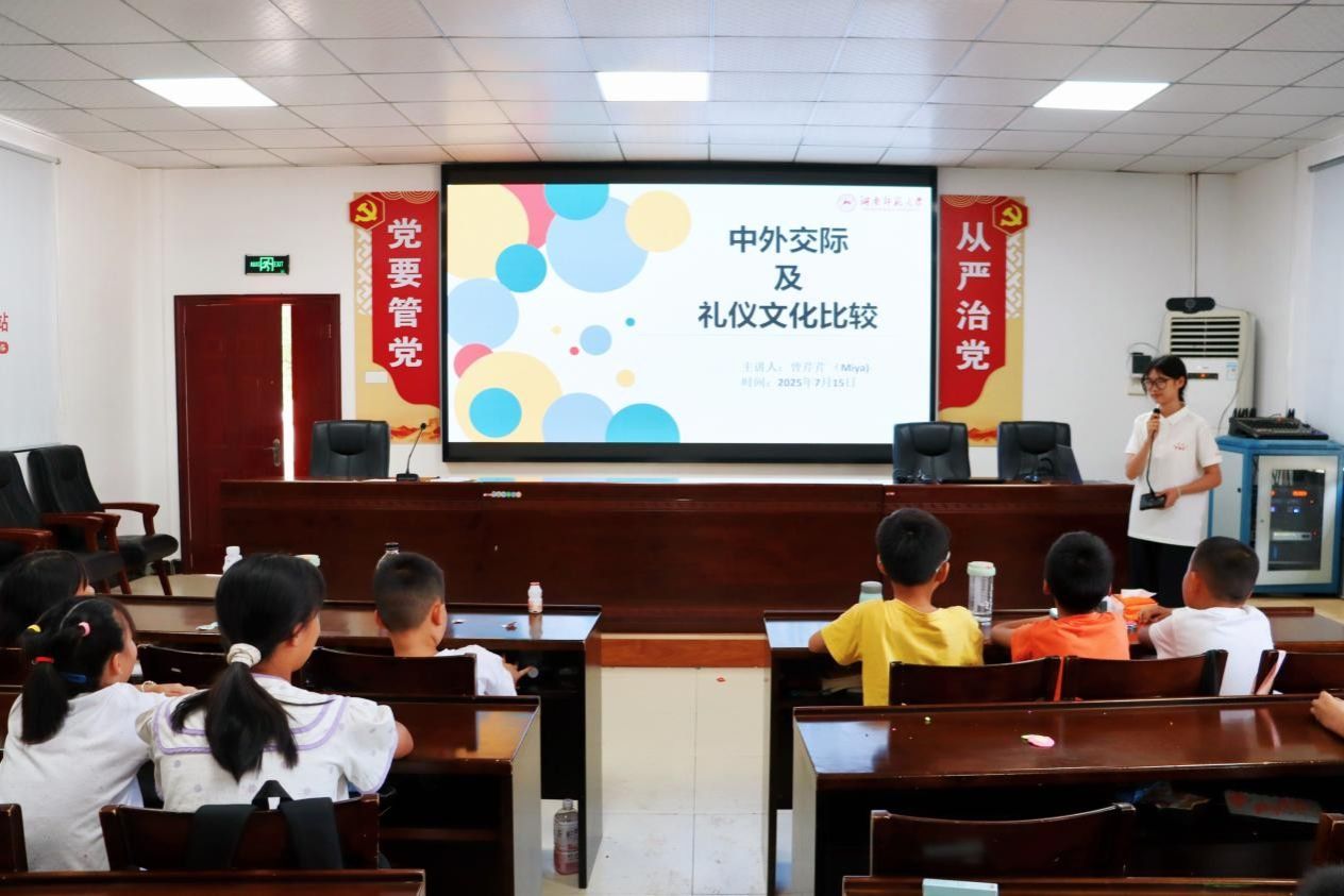 (通讯员 马纳克 杨爽)7月15日上午,澳门pg官网“‘凤’起苗乡‘语’见四方”暑期社会实践团在张家界市慈利县乡阳凤坪村村委服务中心开展国外交际文化及礼仪分享会。此次活动旨在培养学生主动观察、尊重不同文化间差异的意识,引导学生形成“入乡随俗”的跨文化交际观念。