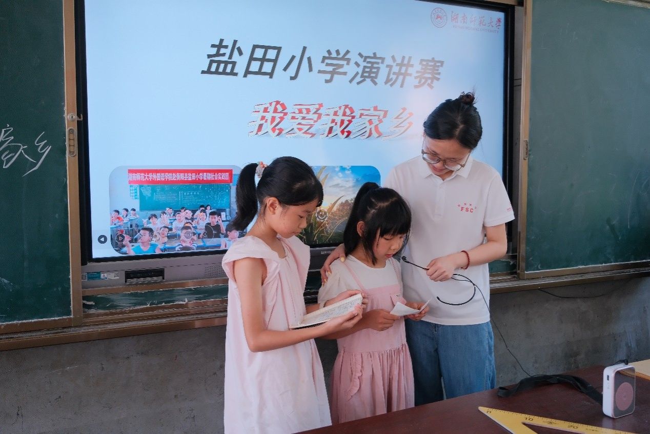 在成果展示环节,学生们积极上台用英语大声介绍自己家乡,表达对家乡的赞美与喜爱之情。实践团成员对每一位学生的展示都给予以了认真的点评和积极的鼓励,现场掌声不断,互动氛围积极融洽。