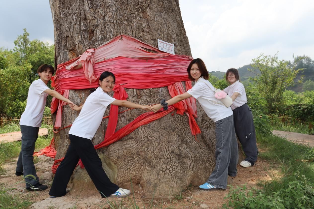 活动初期,实践团成员通过阅读展板内容,学习了红军树命名的由来及演变情况,并通过查阅相关资料,了解到1935年前后贺龙将军在红军树下举行动员大会,收编农民队伍的历史故事。在红军树广场,实践团成员们集体朗读了贺龙之女贺捷生发表在人民日报上的文章选段,进一步了解贺龙将军与当地几代民众通过红军树建立起的深厚情感链接。随后,实践团成员拜访了相关负责人,了解了慈利县政府近年来围绕红军树保护实施的相关举措,如填补树身残缺、修建介绍石碑与防雷设施等,并针对当地红色文化宣传情况进行调查。在负责人的带领下,成员们走近红军树,仰望历经1200年风霜的古树粗壮的树干,细看遭受电击后重生的新芽,感受见证历史实物时带来的厚重感,体味红军树背后承载的家国情怀与使命担当。活动最后,实践队成员们手拉手环抱大树,合影留念。