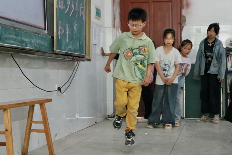 学生们依次进行“跳格子”闯关挑战以获取秘密情报人的第三条线索。