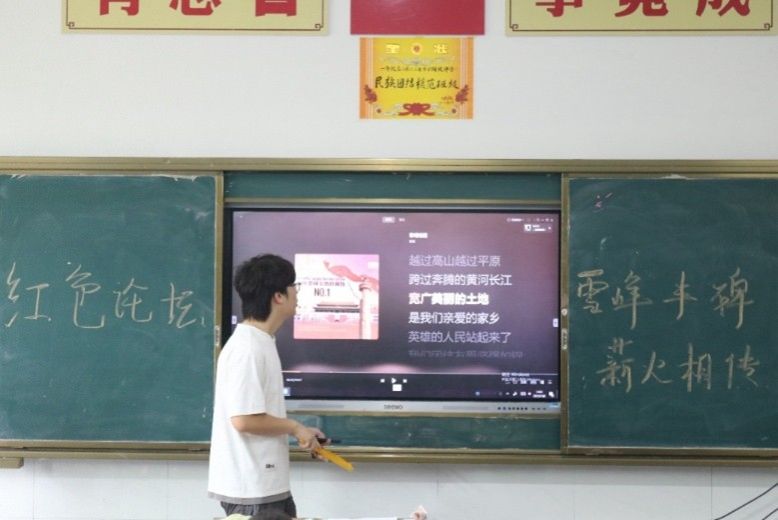 第一次“雪峰丰碑,薪火相传”主题红色论坛中,实践团成员带领学生唱红歌《我和我的祖国》。
