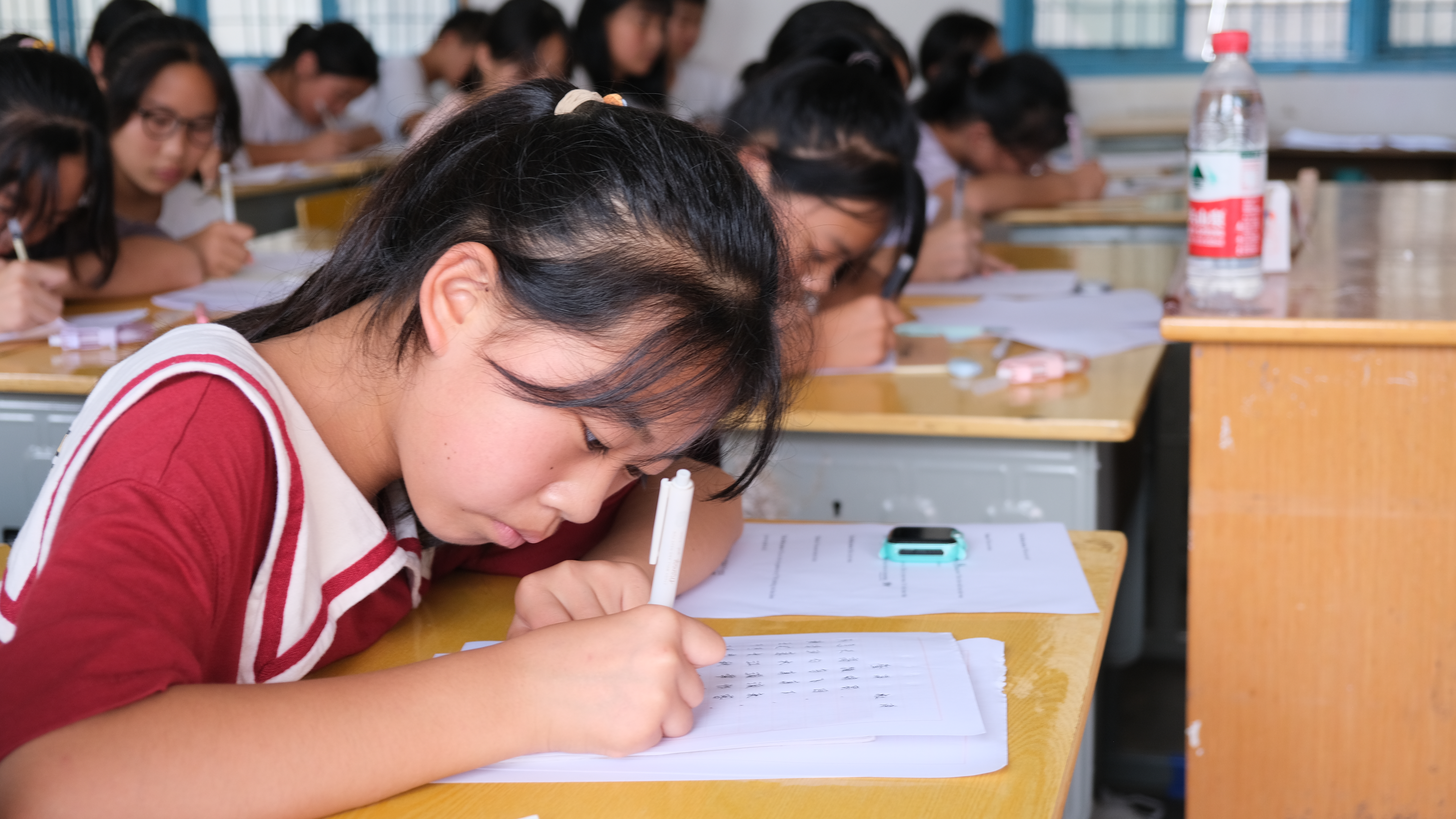 王治力用不同的书法字体引入课程,介绍了汉字的演变过程并过猜字小游戏加深印象,布置了书写杜甫的《登高》的课堂作业。不少学生根据自己的所见所闻积极参与课堂,理解到书法顿笔的要领并完成了老师布置的作业。活动结束后,服务队选取了九位学生的优秀硬笔书法作品进行了展示。后期访谈中,东岳观镇中学学生展现出对于书法和传统文化学习的兴趣。