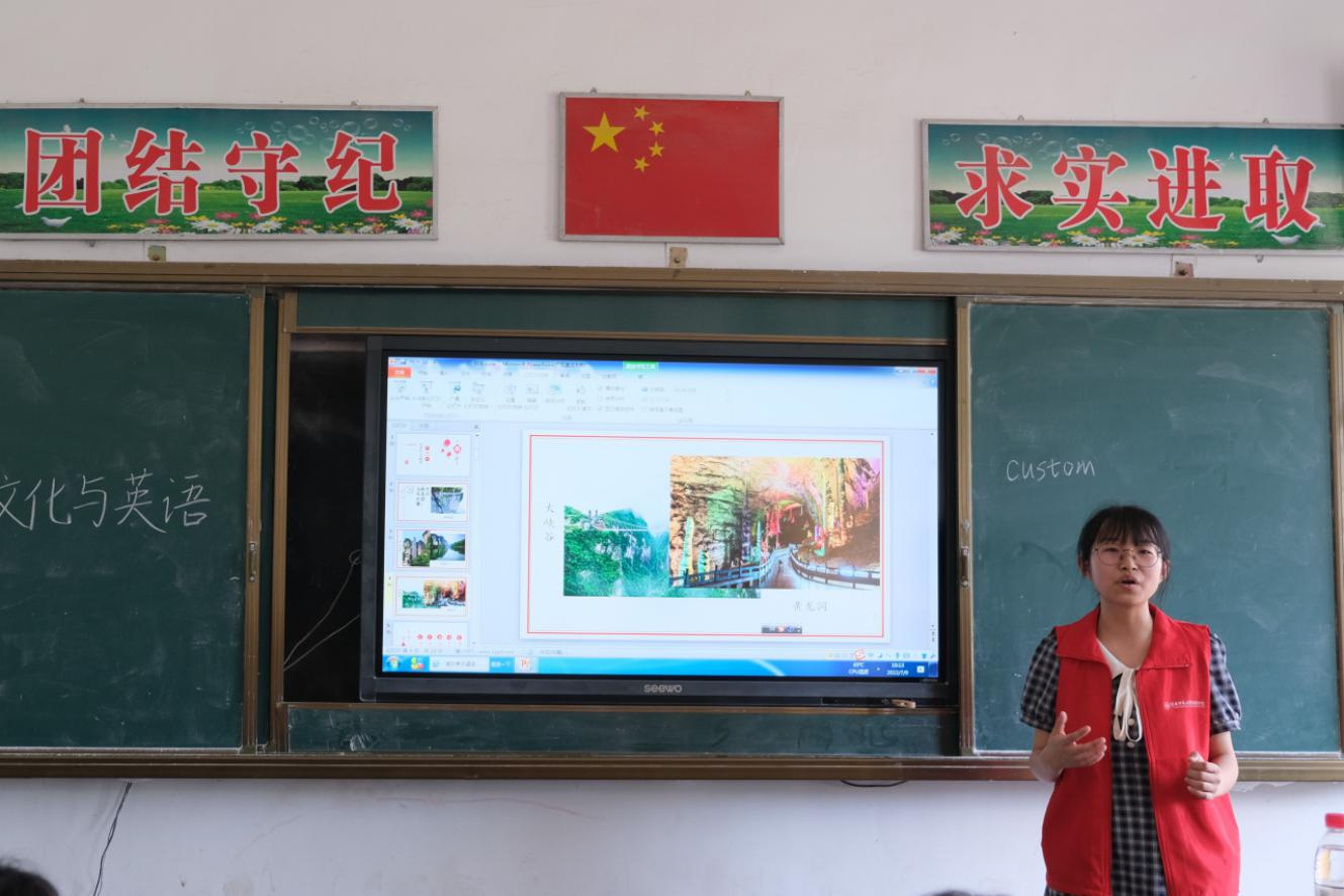 (通讯员 杨涛 孙璨 吴慧譞 张思敏 谢艳容)英语小窗口,民俗大舞台。为了加深同学们对于当地特色民俗文化的了解,培养同学们用外语向世界传播中华文化的意识,7月9日上午,澳门pg官方电子平台赴张家界市慈利县东岳观镇中学暑期实践团开展民俗文化结合英语教学的活动。本次活动由实践团成员李莹负责。