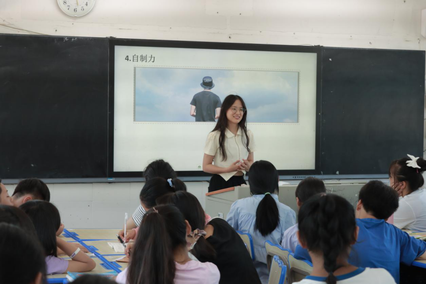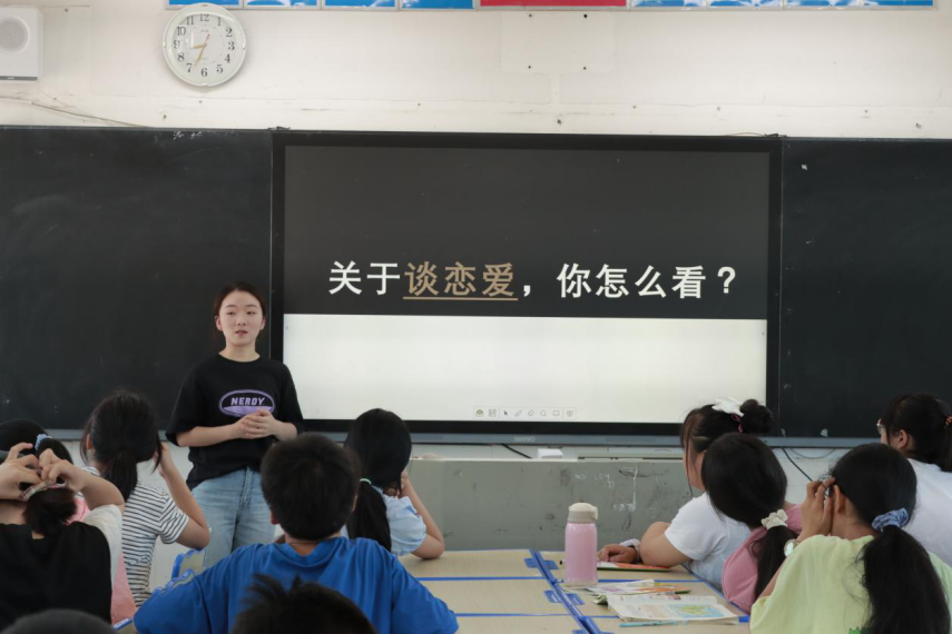 随后,二人就“青春期恋爱”的话题与同学们互相分享观点,帮助同学们理性看待青春期的情感关系,树立正确的恋爱观。此环节中,实践团其他成员也参与讨论,结合自身经历,解答同学们关于青春期的问题,帮助同学们走出青春期的迷茫。活动过程中,同学们展现出高度的热情,积极与实践团成员交流互动,勇于提出自身疑惑,认真聆听实践团成员的分享。