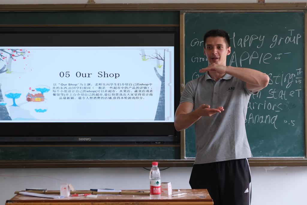 课堂上,爱德华先鼓励学生们进行简单的自我介绍,再围绕学生们日常用词展开教学,通过“触摸”、“扮演”“传声筒”“二十个问题”这四个游戏以及“我们的商店”这一将绘画和英文表达相结合的主题特色课,寓教于乐,让学生们在与外教游戏的过程中和特定的情景下开口说英文。