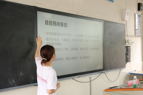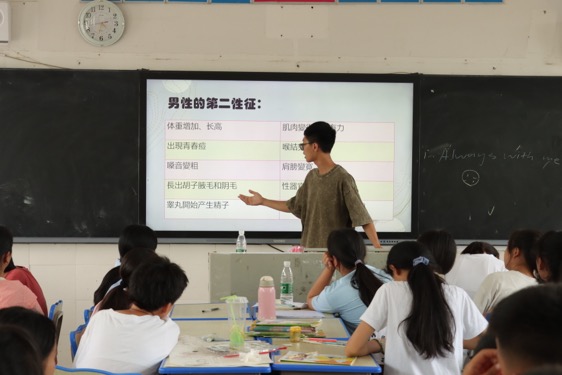 课堂伊始,崔善美引导学生回顾自己及同龄人青春期的生理变化,由此引入课堂。“青春期两大特征为身体和心理发展变化迅速以及开始出现第二性征”,实践团成员分别就男女生第二性征展开说明。崔善美指出,青春期正是学生从幼稚走向成熟的过渡阶段,学生心理发育和生理发育并不同步,引导学生正确认识性成熟,指导他们正确对待两性关系并学会保护自己显得尤为重要。为此,实践团成员在普及生理知识的同时还重点讲解并强调了防性侵安全知识。
